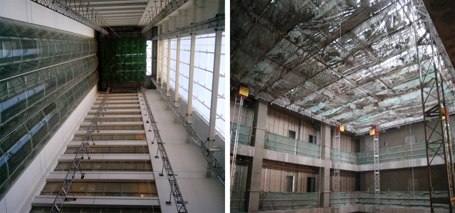 建筑結(jié)構(gòu)高大空間頂部施工是非常困難的一個施工位置,由于從中央大廳底層到頂部一般都在幾十米甚至上百米的高度,屬于大空間,超高的施工部位,傳統(tǒng)的施工方法是用腳手架從底層開始落地滿堂搭設(shè),一直搭設(shè)到頂部的操作面,這種施工方法不僅材料 (腳手架)用量大,工人搭設(shè)的工作量也很大,施工速度慢,很難滿足實(shí)際的施工要求。